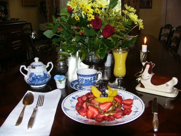 Breakfast is served in what guests say is an elegant dining room. The full breakfast includes such items as fresh fruit, juice, home-made cereal, omelette with asparagus and portobello mushrooms, bagel with eggs, bacon, tomato & cheese, blueberry pancakes and Mennonite sausage. Special dietary needs are met, including vegetarian, vegan and gluten free. Freshly brewed coffee from ground beans and Ceylon tea from loose leaves are served.