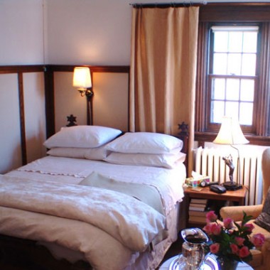 Magnolia Suite: The first room as an antique four poster queen bed, chairs, a desk and a Persian carpet. The second room has a single bed, a wing-back chair, a love seat, TV, armoire, fridge and a large wrap-around window overlooking the backyard. The ensuite bathroom has a tub with shower.