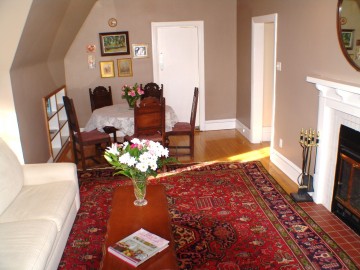 This fully furnished 2-bedroom apartment has a spacious living and dining room.  The living area has a sofa with a full-size pull-out bed, fireplace, two wing chairs and a large south-facing bay window. The main bedroom has a queen bed and the other has two single beds. The kitchen is equipped with cookware. The bathroom has a tub with shower.  The apartment has a balcony overlooking the garden in the backyard. Rate for 1 person is from $159 per night (contact us for more rate information) — includes a gourmet breakfast, WiFi and parking.